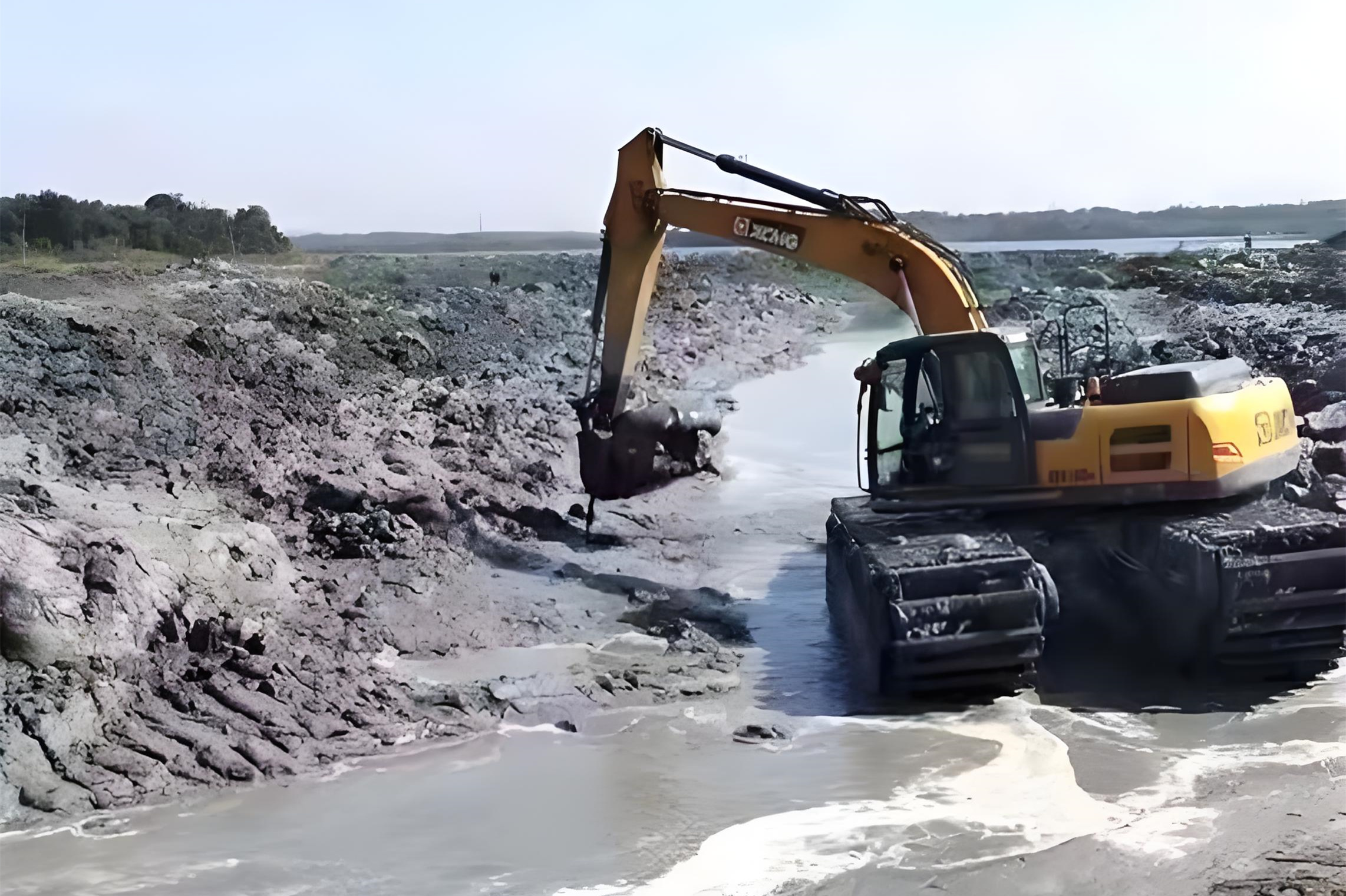 對(duì)于流塑狀淤泥(用手抓會(huì)從指縫溜走),長(zhǎng)臂挖機(jī)的優(yōu)勢(shì)更明顯。這種淤泥承載力極差,挖機(jī)一旦陷入很難脫困,長(zhǎng)臂挖機(jī)可以 “遠(yuǎn)程作業(yè)”,用鏟斗將淤泥扒到岸邊,減少設(shè)備與淤泥的直接接觸。同時(shí),長(zhǎng)臂的 “杠桿效應(yīng)” 能更輕松地?cái)噭?dòng)深層淤泥,配合泥漿泵將其抽排出去。